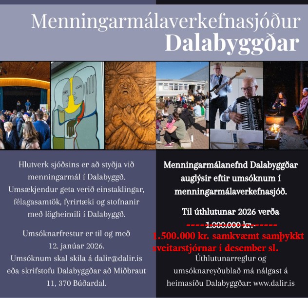 Menningarmálanefnd Dalabyggðar auglýsir eftir umsóknum í menningarmálaverkefnasjóð. Til úthlutunar 2026 verða 1.500.000 kr.- (ath.hækkun um 500 þús.kr. skv.ákvörðun sveitarstjórnar við aðra umræðu um fjárhagsáætlun komandi ára sem fram fór 11.desember sl.) Hlutverk sjóðsins er að styðja við menningarmál í Dalabyggð og er það gert með því að veita styrki eftir því sem menningarmálanefnd Dalabyggðar telur þjóna markmiðum sjóðsins. Umsækjendur í sjóðinn …