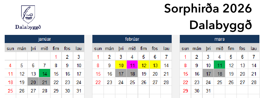 Sorphirðudagatal 2026 er komið á heimasíðu sveitarfélagsins: Sorphirða Á sömu síðu er einnig uppfært yfirlit grenndarstöðva fyrir frístundahús. Unnið er að flutning á ílátum frá skýlinu við tjaldsvæðinu á Laugum að Sælingsdalstungu. Áréttað er að grenndarstöðvarnar eru einungis fyrir heimilisúrgang frá frístundahús í sveitarfélaginu. Sé um annars konar sorp eða úrgang að ræða (s.s. timbur, brotajárn eða spilliefni), skal skila því …