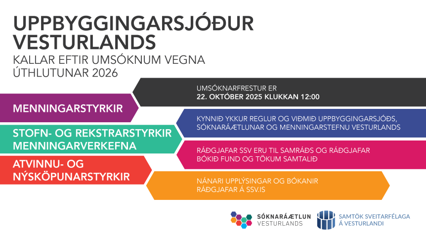 Opnað hefur verið fyrir umsóknir í Uppbyggingarsjóð Vesturlands fyrir úthlutun ársins 2026. Tilgangur Uppbyggingarsjóðs er að styrkja annars vegar menningarverkefni og hinsvegar atvinnu- og nýsköpunarverkefni á Vesturlandi. Sjóðurinn er samkeppnissjóður og eru umsóknir metnar út frá þeim markmiðum og áherslum sem koma fram í Sóknaráætlun Vesturlands. Að þessu sinni er kallað eftir umsóknum um styrki til: atvinnuþróunar og nýsköpunar menningarverkefna …