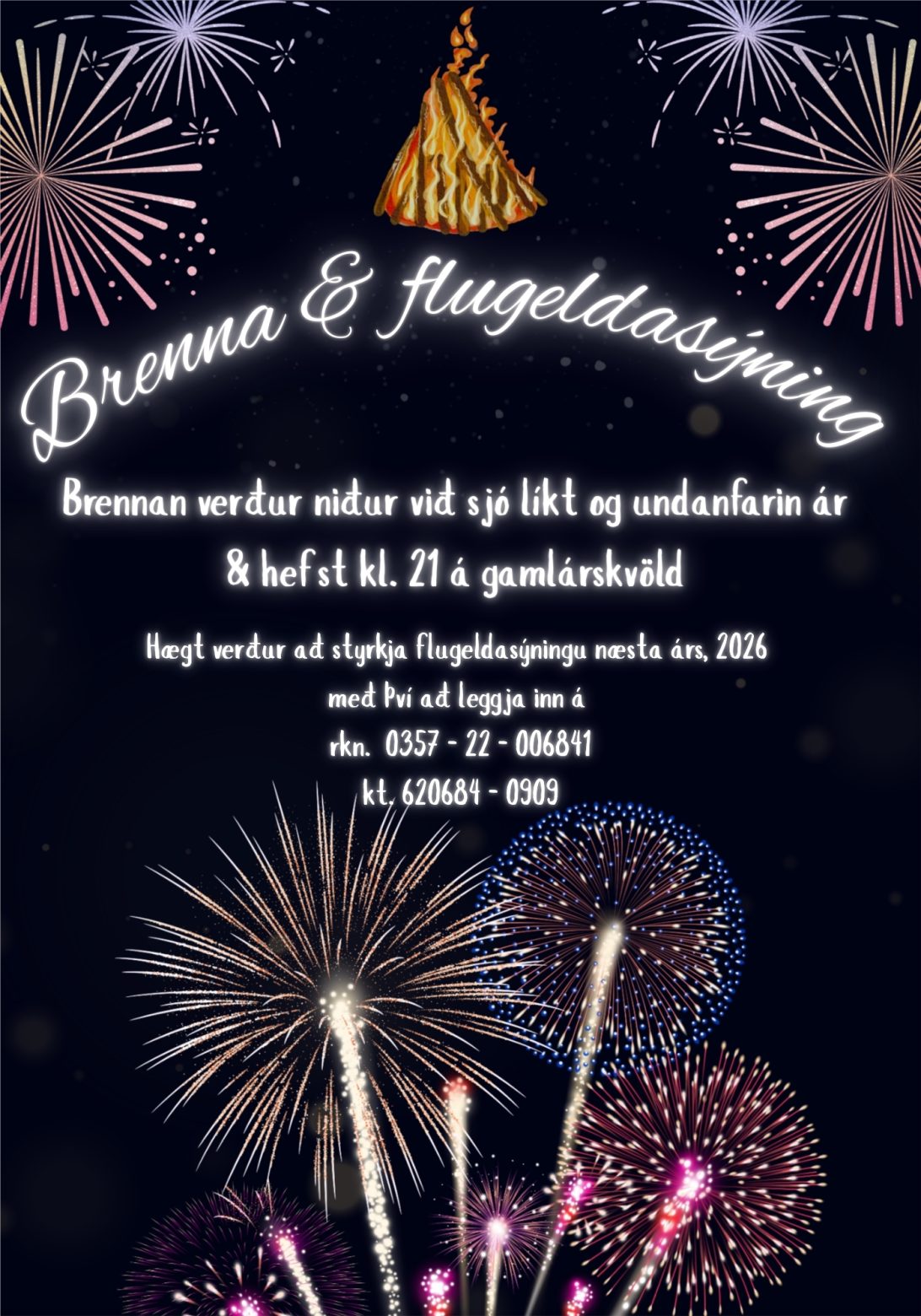 Brenna og flugeldasýning á gamlárskvöld kl. 21.00