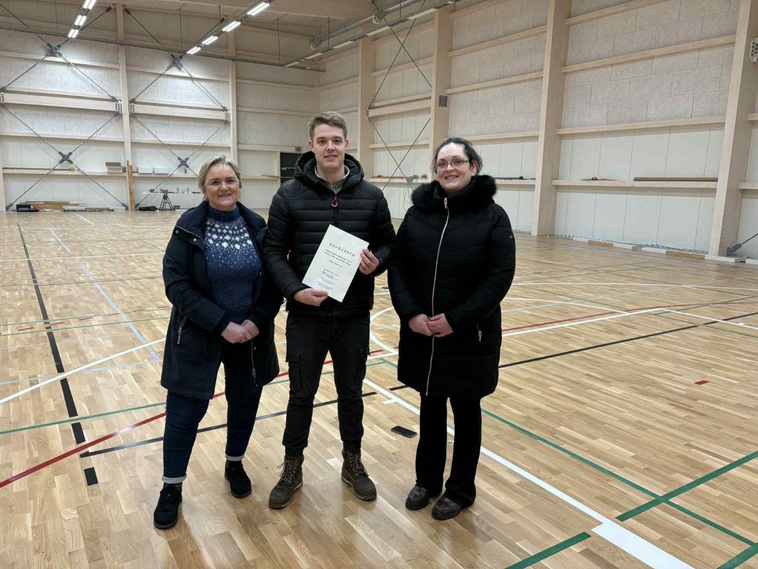 Á mynd hér með má sjá þær Berþóru Jónsdóttur og Jónínu Kristínu Guðmundsdóttur frá kvenfélaginu með Ísaki Sigfússyni inn á nýja parketinu okkar sem nú er búið að merkja upp að mestu.